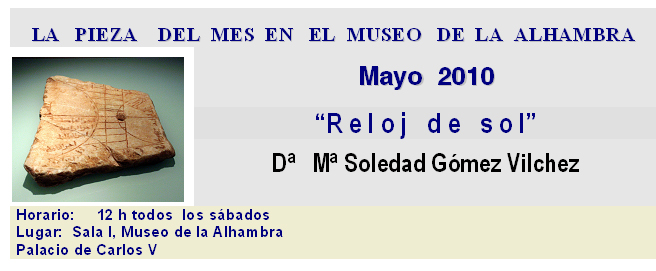 En esta intervención se analizarán en profundidad todos estos elementos que componen este curioso objeto, así como su función y su uso. Se hablará de la gnómica hispanomusulmana y de la esciagrafía o estudio de las sombras, y sus aplicaciones en este cuadrante solar. Se estudiarán además las particularidades y anomalías de esta pieza, comparándola con otros modelos coetáneos, como los cuadrantes solares de Madinta al-Zahra o el que existe en el Museo Arqueológico de Almería.