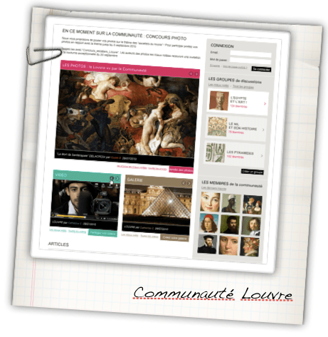 En el día de ayer, el Museo del Louvre, en colaboración con Orange, lanzó la «Communauté Louvre«, una comunidad on line de profesionales y personas interesadas tanto en el Museo del Louvre como en la arqueología, el arte, la cultura y los museos.  El objetivo es crear un espacio flexible y participativo, hecho por y para los usuarios.