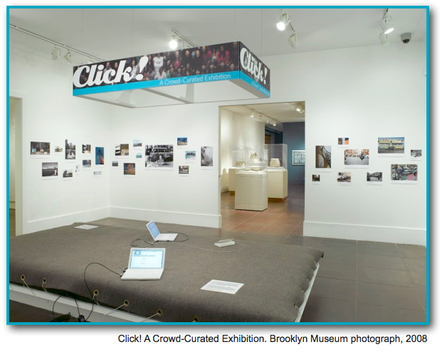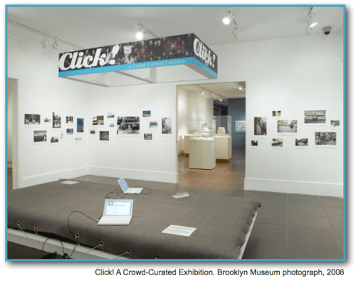 El Museo del Brooklyn empezó esta dinámica con Click, una exposición fotográfica en la que se apelaba a “la sabiduría de la multitud”. El proceso constó de tres parte: una convocatoria abierta para que diferentes artistas enviaran sus propuestas; una selección en la que el público y la comunidad on line del museo eligieron las obras; y una exposición en el museo. Todo el proceso estuvo acompañado de evaluciones para conocer cómo el público percibe una obra en función de su experiencia previa, un libro, una meetup en el museo, etc…